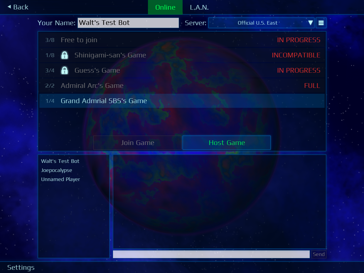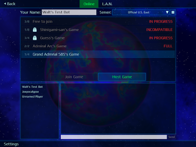 But now 0.13.4 adds "online multiplayer", which allows players to play with others online without having to share their I.P. addresses or setup port forwarding. This works thanks to what's called the "Cosmoteer Lobby Server" (or CosmoServer for short), which is a little program that players can connect to and join an online "lobby" where they can then host games and play with anyone else in that lobby, just as if they were on the same LAN. There's currently one official server called "Official U.S. East" (located in New York, NY, USA), but you can also run your own server if you want.
